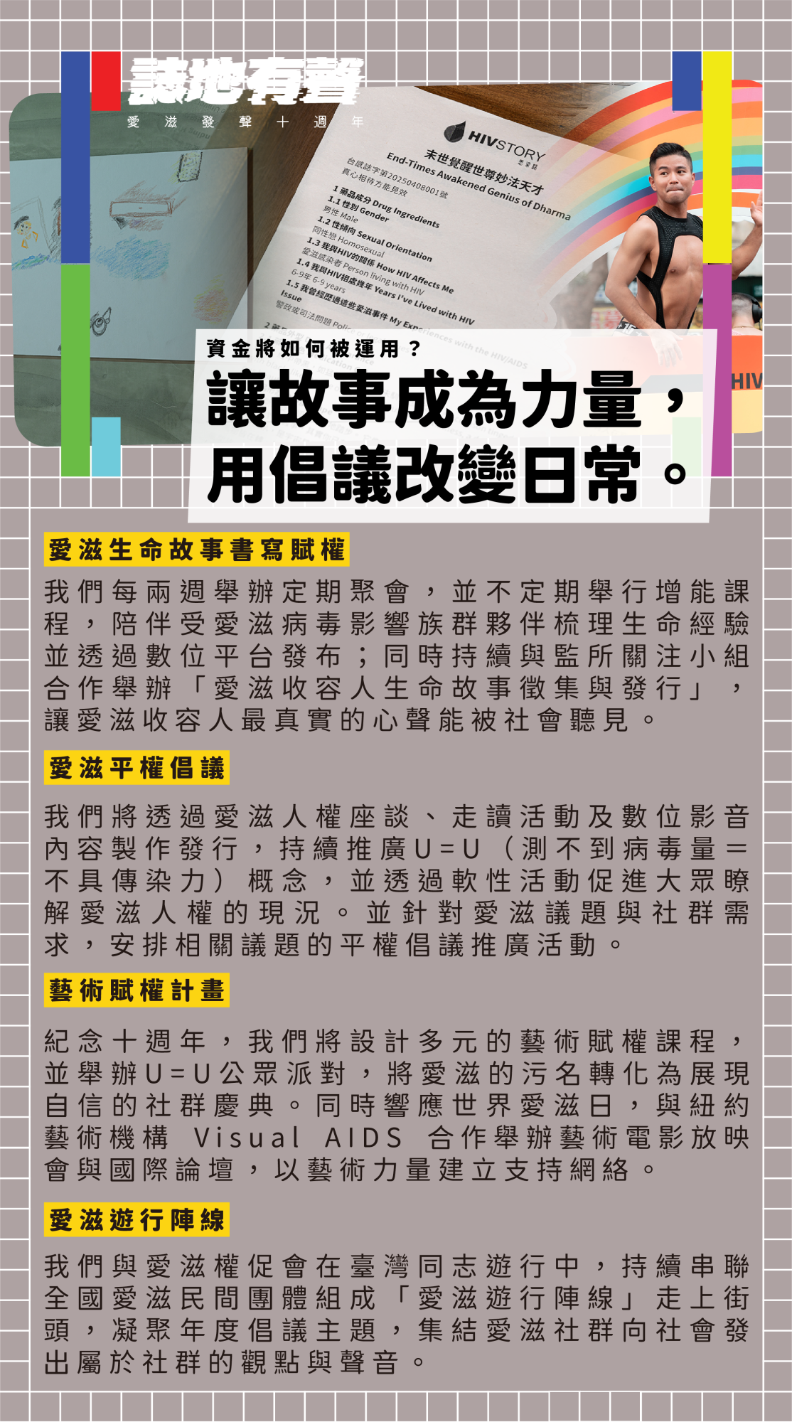 這十年來,我們有幸與大家一起為愛滋發聲:期盼在未來的日子裡,你我仍能並肩同行,成為支撐愛滋人權的堅實力量。
